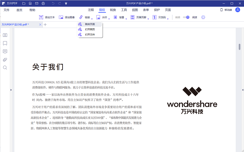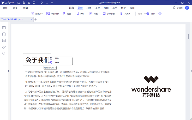 上图表示对“关于我们”设置了链接,单击红色矩形框中任意位置即可跳转至相应位置。再次单击“编辑”选项卡中的“链接”按钮,然后在已设置链接矩形框上右击,弹出如下菜单,单击“编辑链接”即可对已设置的链接进行重新设置,单击“删除”即可删除已设置的链接。