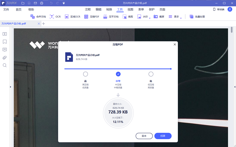 选择压缩后的页面显示质量。可以根据压缩后文件大小的要求,对应选择不同的压缩质量,压缩后的文件质量越低,那么压缩后的文档所占据的存储空间也就越小。当前我们选择的质量为中,压缩后的文件大小为23.24M,对比开始的文件大小,大约可以节约一半的存储空间。