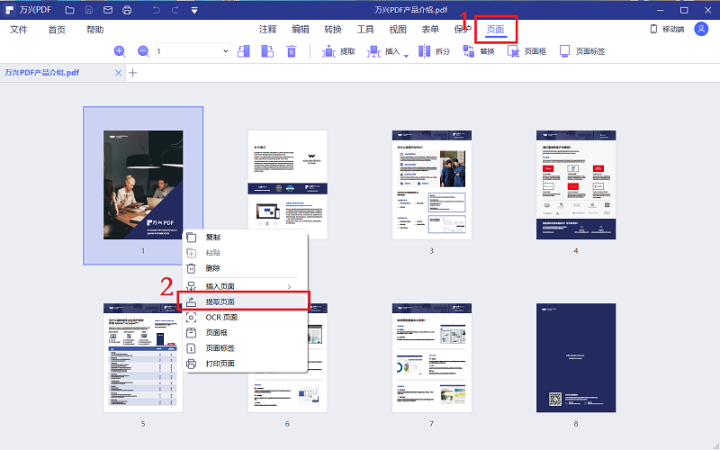 打开文档步骤同上,不再赘述。之后,点击“页面”选项卡下的“提取”选项,或者在要提取的页面上方点击鼠标右键,选择“提取页面”选项均可进入“提取页面”选项。