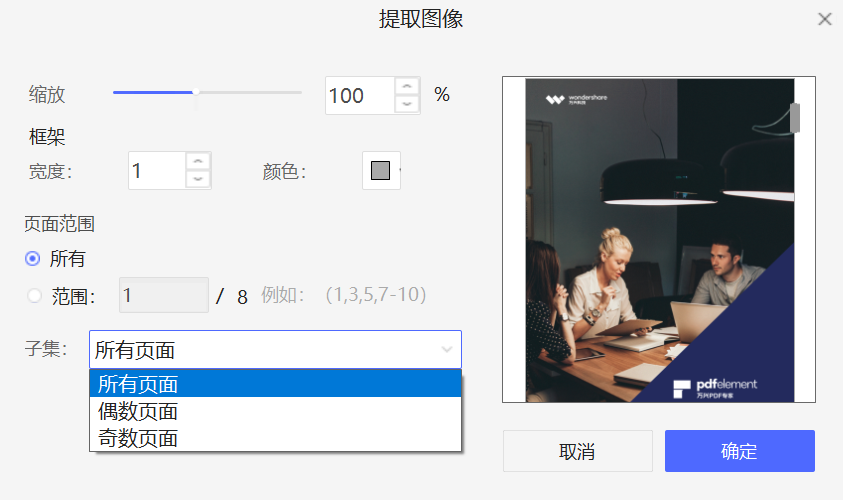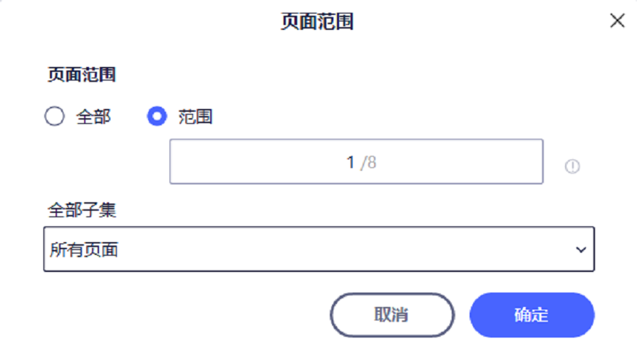 之后弹出的窗口比较简单,我们只需在这里设置要提取的页面范围即可。选择“所有”或“范围”确定大致页面,之后在“子集”处选择提取奇数页面、偶数页面或全部页面确定实际转化范围。