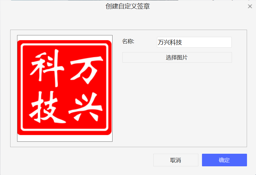 3、进入自定义签章面板以后,在该窗口中输入签章的名称,再点击“选择图片”按钮选择提前准备的图片文件,最后点击“确定”按钮即可完成签章的创建。