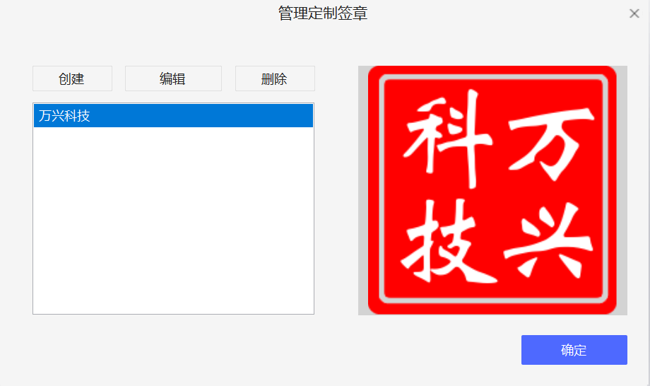删除:过多的签章不利于我们的工作,如果有多于签章需要删除,我们需要先在下面的列表框中选中我们需要删除的签章,然后点击此按钮即可从自定义签章中将其移除。